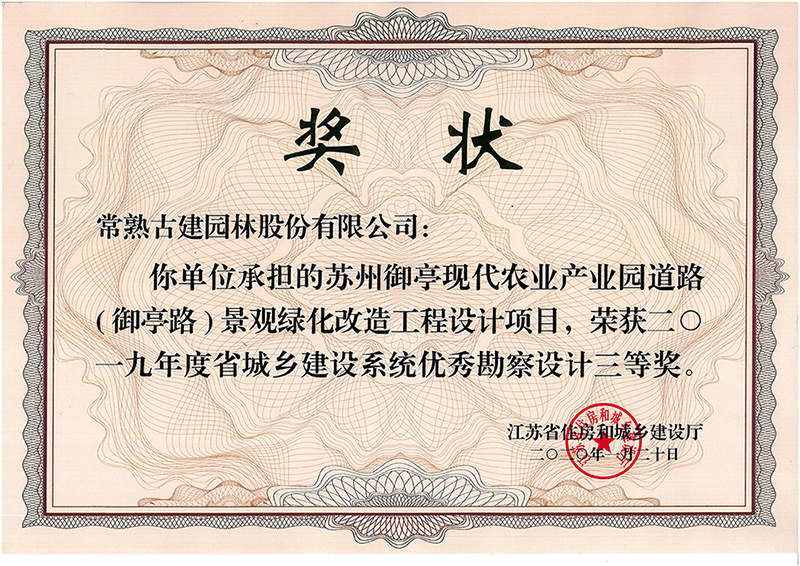 蘇州御亭現(xiàn)代農(nóng)業(yè)產(chǎn)業(yè)園道路(御亭路)景觀綠化改造工程設(shè)計項目榮獲2019年度省城鄉(xiāng)建設(shè)系統(tǒng)優(yōu)秀勘察設(shè)計三等獎
