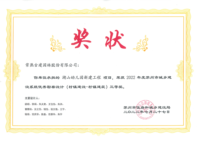 湖山幼兒園新建工程項目榮獲2022年度蘇州市城鄉(xiāng)建設(shè)系統(tǒng)優(yōu)秀勘察設(shè)計(村鎮(zhèn)建設(shè)-村鎮(zhèn)建筑)三等獎