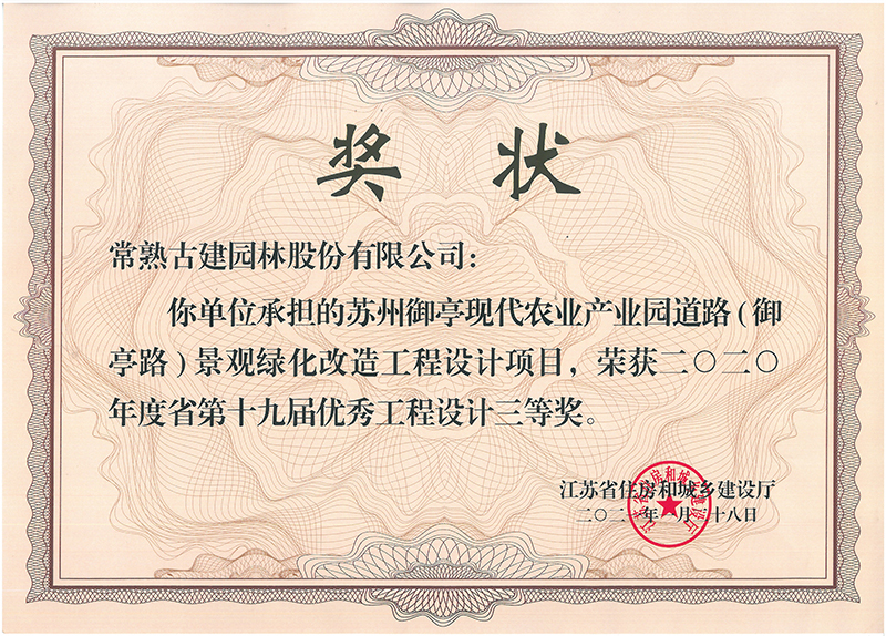 蘇州御亭現(xiàn)代農(nóng)業(yè)產(chǎn)業(yè)園道路(御亭路)景觀綠化改造工程設(shè)計項目榮獲2020年度省第十九屆優(yōu)秀工程設(shè)計三等獎