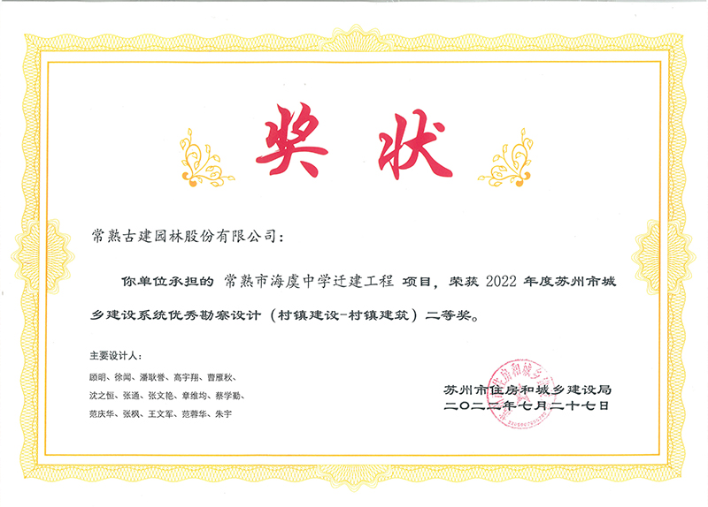 常熟市海虞中學(xué)遷建工程項目榮獲2022年度蘇州市城鄉(xiāng)建設(shè)系統(tǒng)優(yōu)秀勘察設(shè)計(村鎮(zhèn)建設(shè)-村鎮(zhèn)建筑)二等獎