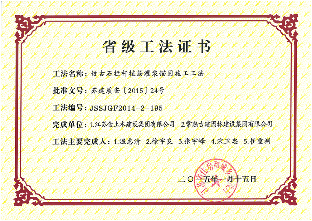 仿古石欄桿植筋灌漿錨固施工工法獲省級(jí)工法