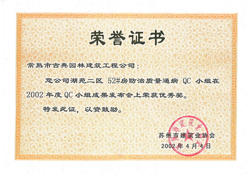 湖苑二區(qū)52#房防治質(zhì)量通病榮獲QC成果優(yōu)秀獎(jiǎng)